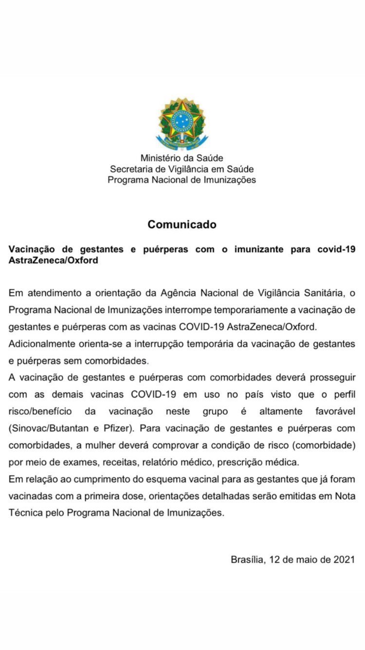 No final de abril, o Programa Nacional de Vacinação (PNI) decidiu que grávidas e puérperas, até 45 dias depois do parto, deviam ser vacinadas devido ao cenário epidemiológico com elevada circulação do coronavírus e aumento de óbitos materno pela Covid-19.