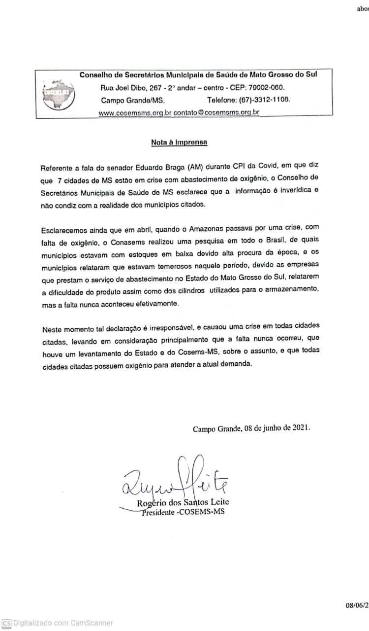 Referente a fala do senador Eduardo Braga (AM) durante CPI da Covid, em que diz que 7 cidades de MS estão em crise com abastecimento de oxigênio, o Conselho de Secretários Municipais de Saúde de MS esclarece que a informação é inverídica e não condiz com a realidade dos municípios citados.