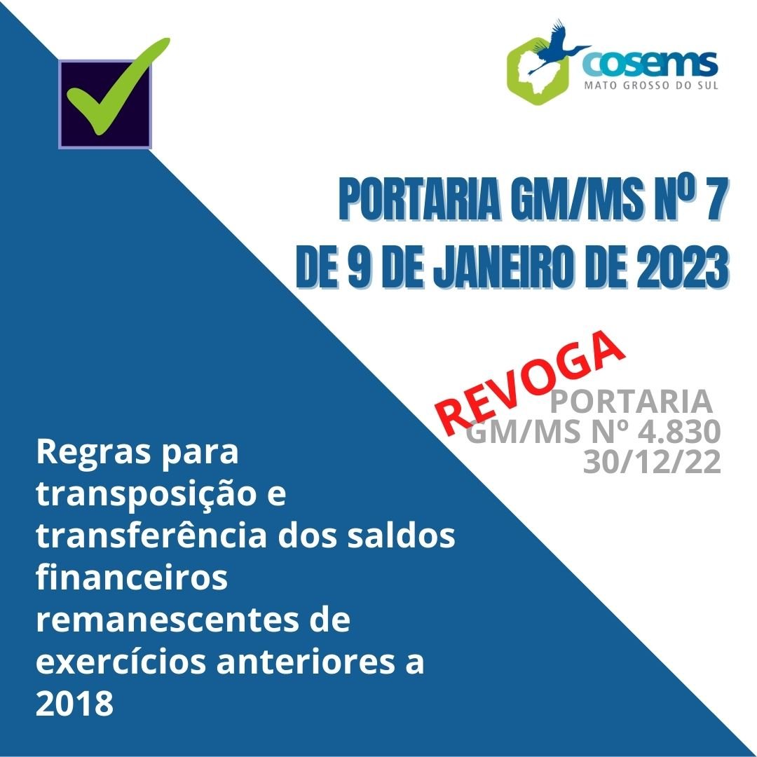 Foi publicada ontem, dia 11 de janeiro, PORTARIA GM/MS Nº 7, DE 9 DE JANEIRO DE 2023, que revoga a Portaria GM/MS nº 4.830, de 30 de dezembro de 2022, que define regras para transposição e transferência dos saldos financeiros remanescentes de exercícios anteriores a 2018, constantes nos Fundos Estaduais, Distrital e Municipais de Saúde, provenientes de repasses do Ministério da Saúde e dá outras providências.