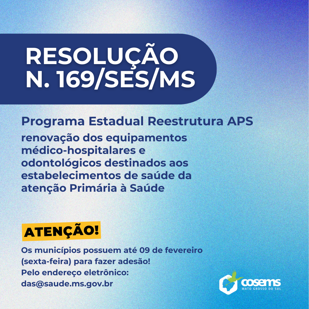 O Governo do Estado de MS instituiu, pela RESOLUÇÃO N. 169/SES/MS, de 26 de janeiro o Programa Estadual Reestrutura APS – reestruturação de equipamentos da Atenção Primária à Saúde no ano de 2024. Os municípios possuem até o dia 09 para fazer a adesão, pelo endereço eletrônico: das@saude.ms.gov.br