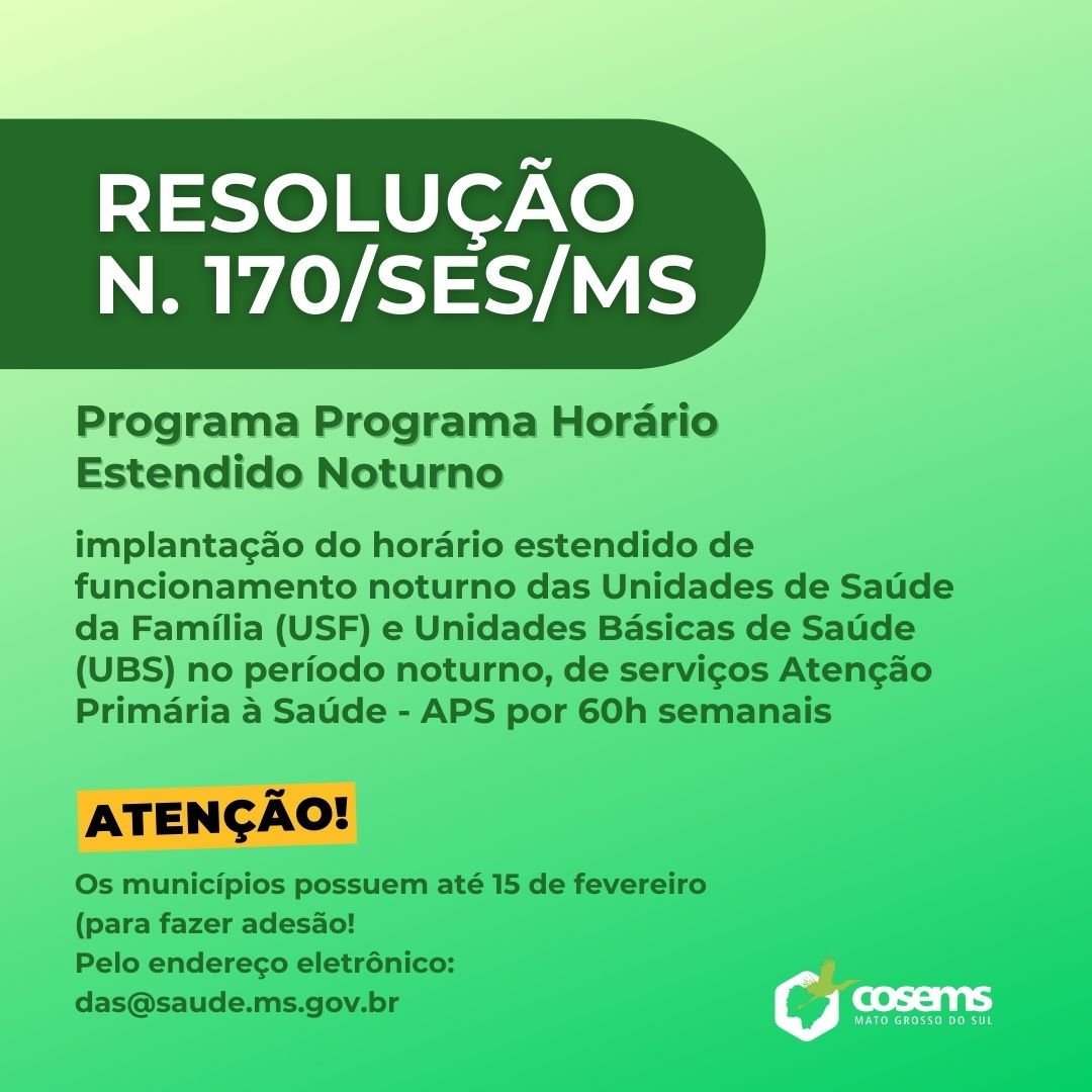 O Governo do Estado de MS instituiu, pela RESOLUÇÃO N. 170/SES/MS, de 26 de janeiro, em caráter temporário o incentivo estadual para o “Programa Horário Estendido Noturno” nas competências janeiro a dezembro de 2024. Os municípios possuem até o dia 15 para fazer a adesão, pelo endereço eletrônico: das@saude.ms.gov.br
